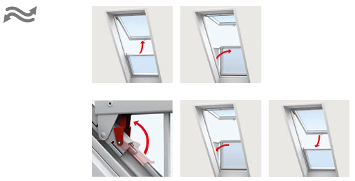 Za otvaranje krovnog balkona jednostavno okrenite donju ručku gornjeg prozora u okomiti položaj i gurnite gornji prozor dok se potpuno ne otvori. Zatim gurnite vrh donjeg prozora prema van i zaključat će se u okomitom položaju.